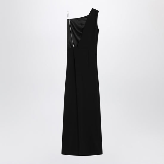 Long dress by max mara pianoforte in heavy black cady, characterized by a draped bustier on the right shoulder, asymmetrical cut-out neckline at the back, side slit, side zip closure, and jewel strap. size and fit - model wears size 40 it model measurements: height: 182 cm chest: 79 cm waist: 62 cm hips: 90 cm