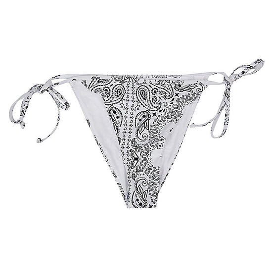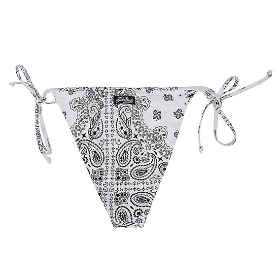 White swim briefs with black decorations, high waist with side laces, logo on the back. bandana print bikini bottoms size and fit - this piece fits true to size. we recommend you get your regular size. model is 1,75m / 5ft 8in wearing size s