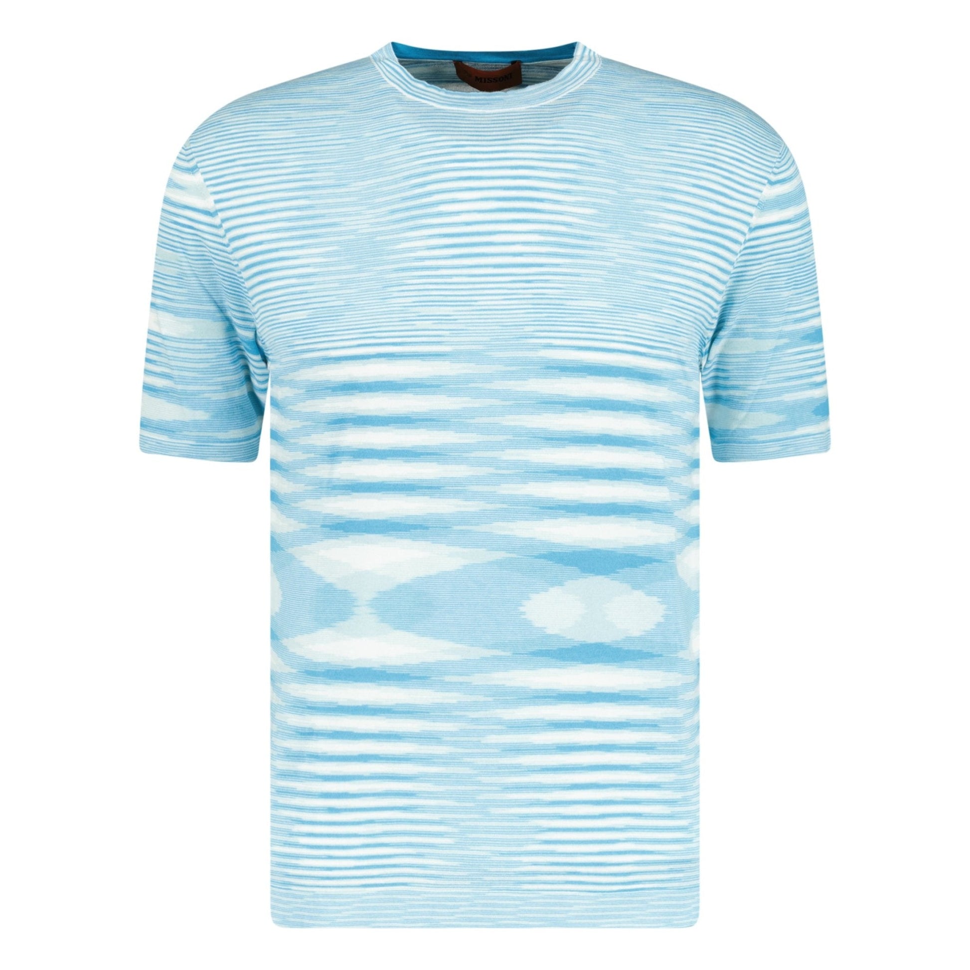 step up your fashion game with the missoni knitted stripe t-shirt in a classic white and blue colorway. this iconic piece from missoni showcases their signature knitted stripe pattern, delivering a timeless and sophisticated look. crafted with meticulous attention to detail, this t-shirt offers a perfect blend of comfort and style. made from high-quality materials, it provides a soft and luxurious feel against the skin. whether you're dressing up or going for a casual vibe, the missoni knitted stripe t-shirt is a versatile addition to any wardrobe. shop now and elevate your fashion ensemble with this coveted white and blue striped t-shirt from missoni.
