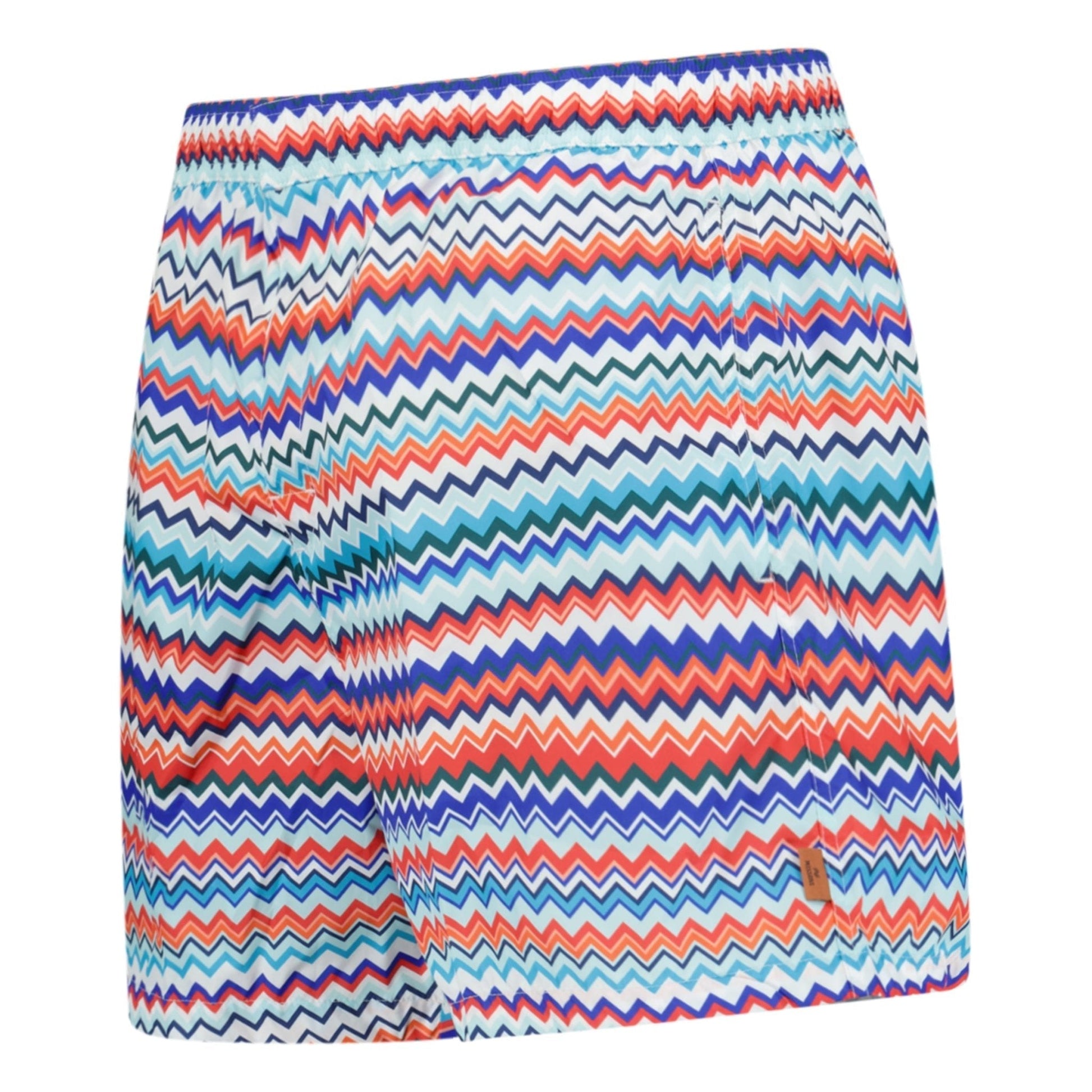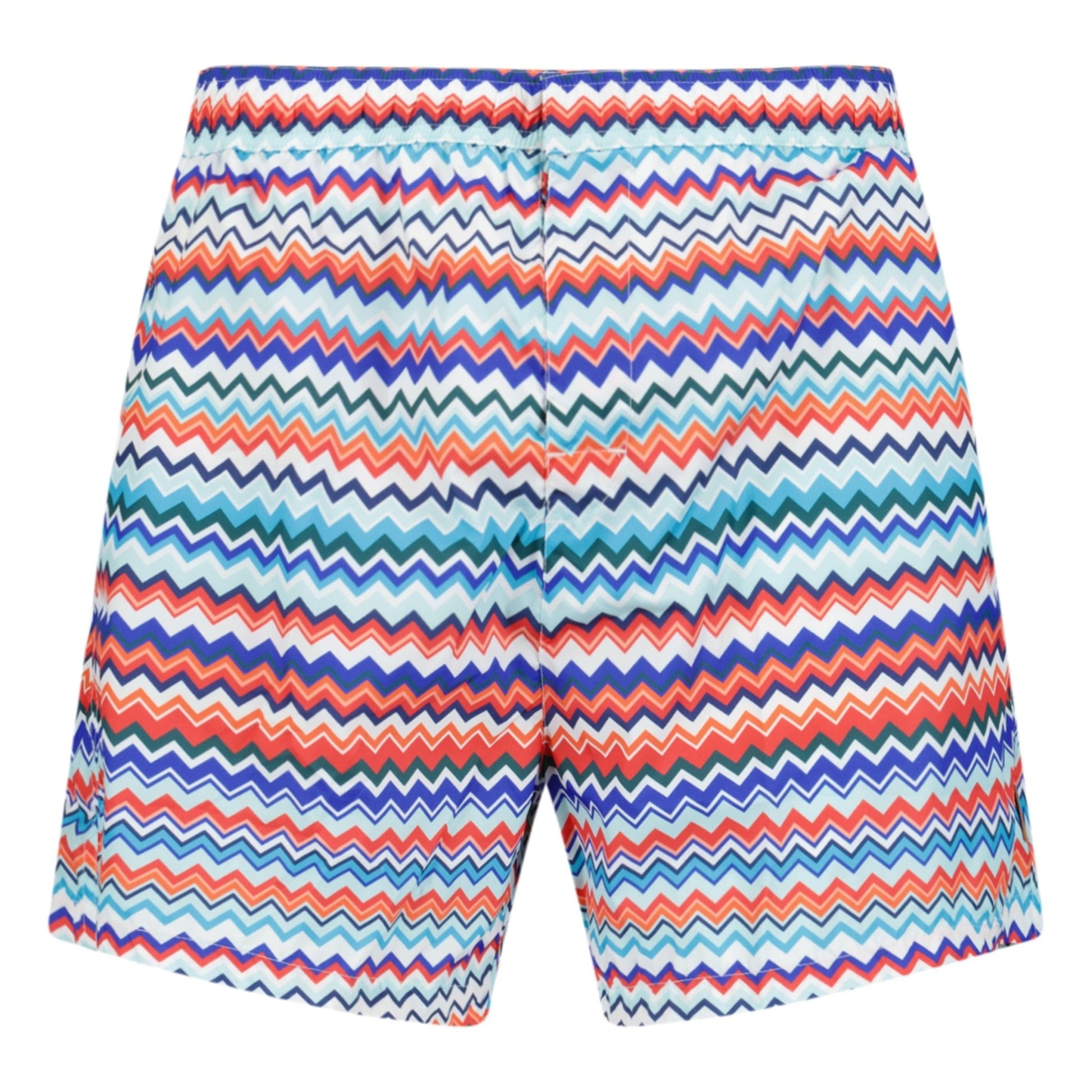 make a splash with missoni zig zag swim shorts in vibrant multi-colour. crafted with the iconic zigzag pattern, these shorts exude bold style and italian luxury. with a comfortable fit and eye-catching design, they're perfect for poolside lounging or beach outings. elevate your swimwear collection with missoni's signature flair.