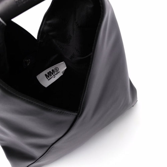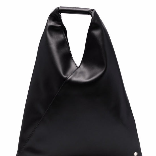 Black calf leather grained texture triangle shape single top handle main compartment japanese small handbag size and fit - depth: 5.0 centimetres. handle: 10.0 centimetres. height: 35.0 centimetres. width: 35.0 centimetres.