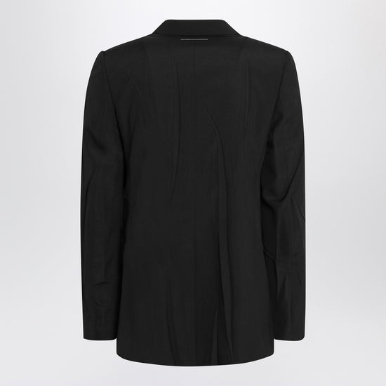 Single-breasted jacket by mm6 maison margiela in a black virgin wool blend, characterized by a front button closure, classic lapels, two flap pockets at the front, long sleeves, crumpled pleat design, and white stitch line logo on the back.