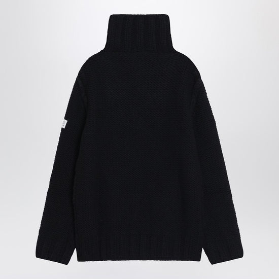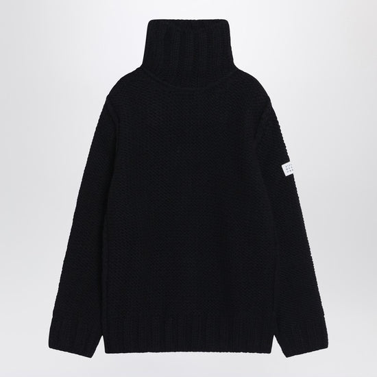Mm6 maison margiela black virgin wool sweater, featuring a high collar, long sleeves, one of which has a numeric signature patch and ribbed edges.