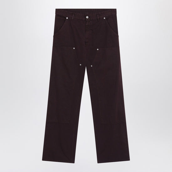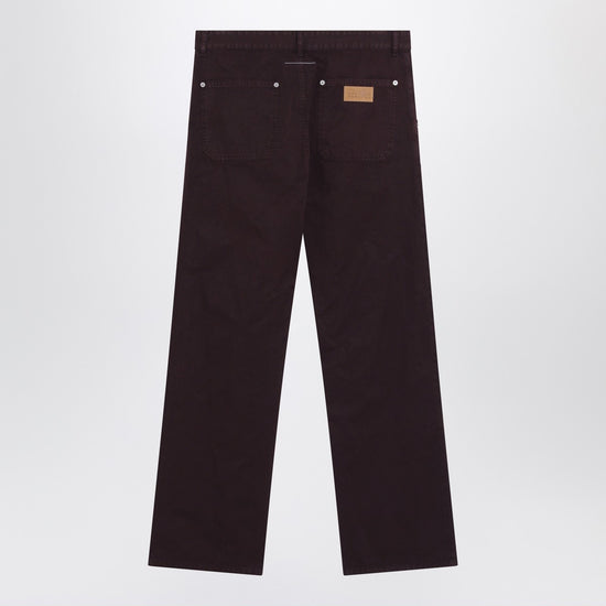 Straight-leg trousers by mm6 maison margiela in burgundy cotton, featuring a front zip and button closure, belt loops, two side pockets, two patch pockets on the back, rivet details on the knees, numeric signature patch, and white stitch line logo on the back.