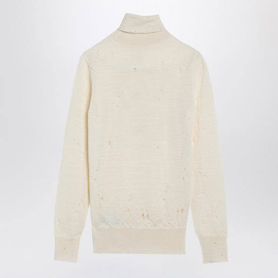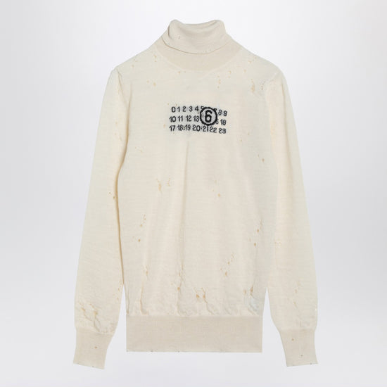 Mm6 maison margiela white virgin wool sweater, featuring long sleeves, a high collar, ribbed edges, all-over distressed details, and a contrasting numeric signature intarsia on the front. size and fit - model wears size s model measurements: height: 179 cm chest: 82 cm waist: 65 cm hips: 90 cm