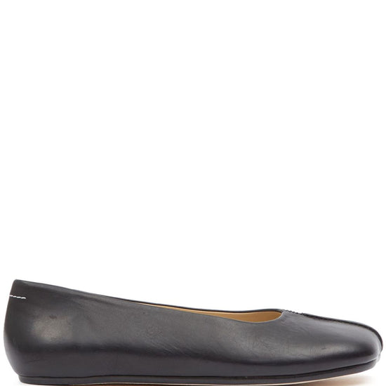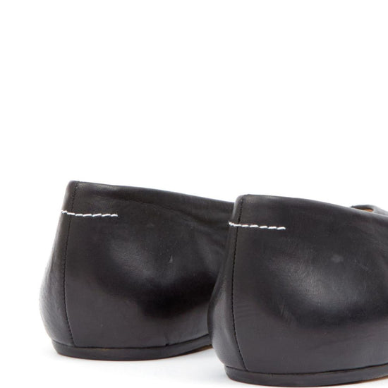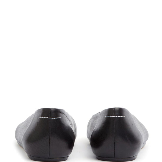 Black calf leather smooth grain signature single-stitch logo moc stitching asymmetric toe branded leather insole flat sole pull-on style leather ballets