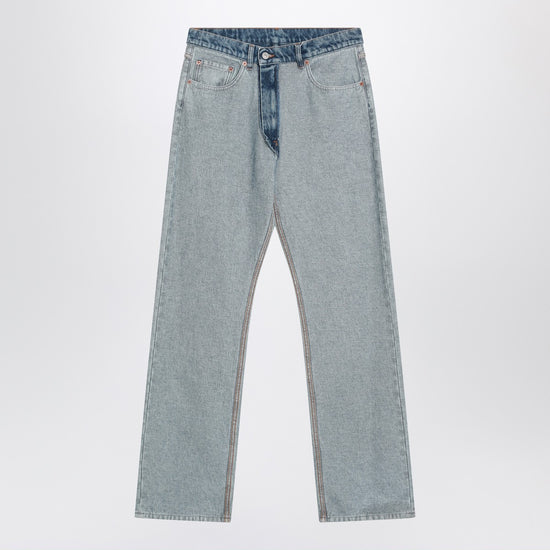 Mm6 maison margiela jeans in two-tone blue cotton denim with a faded effect, featuring a straight leg, front closure, belt loops, five classic pockets, and white stitch line on the back. size and fit - model wears size 32 model measurements: height: 189 cm chest: 104 cm waist: 78 cm hips: 95 cm