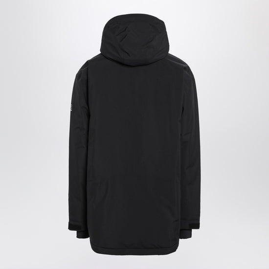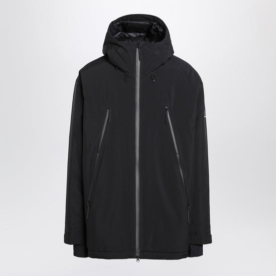 Black jacket by mm6 maison margiela created in collaboration with salomon, featuring double front zip closure, long sleeves with one sleeve detailed by numeric logo, adjustable velcro cuffs, four zipped front pockets, and hood with drawstring. size and fit - model wears size l model measurements: height: 193 cm chest: 95 cm waist: 78 cm hips: 86 cm