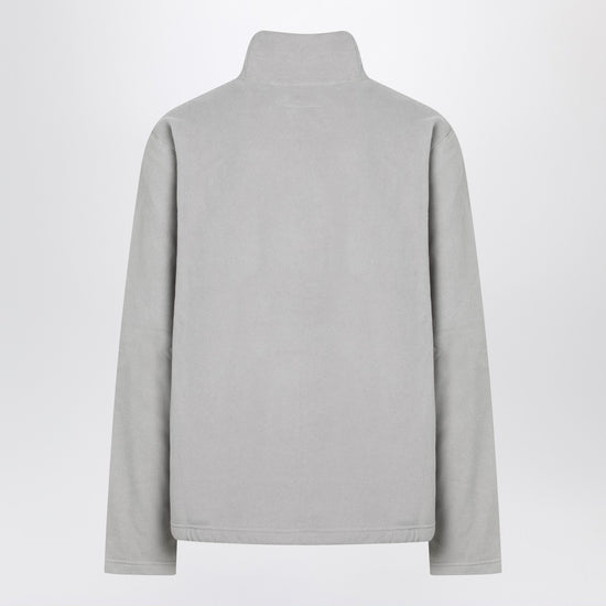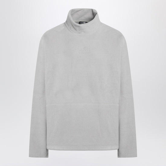 Light gray fleece by mm6 maison margiela created in collaboration with salomon, featuring long sleeves, high collar, tonal stitching, tonal embroidered numeric logo on the front, and white stitch line on the back. size and fit - model wears size l model measurements: height: 193 cm chest: 95 cm waist: 78 cm hips: 86 cm