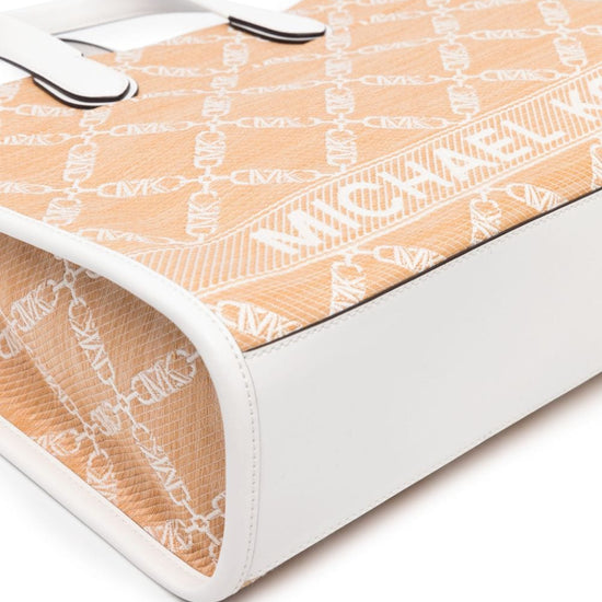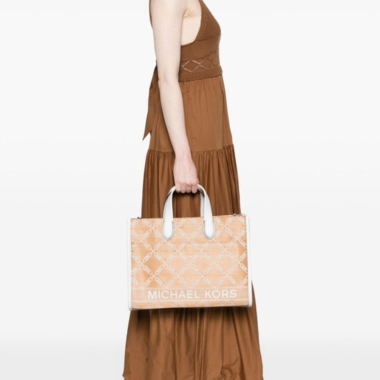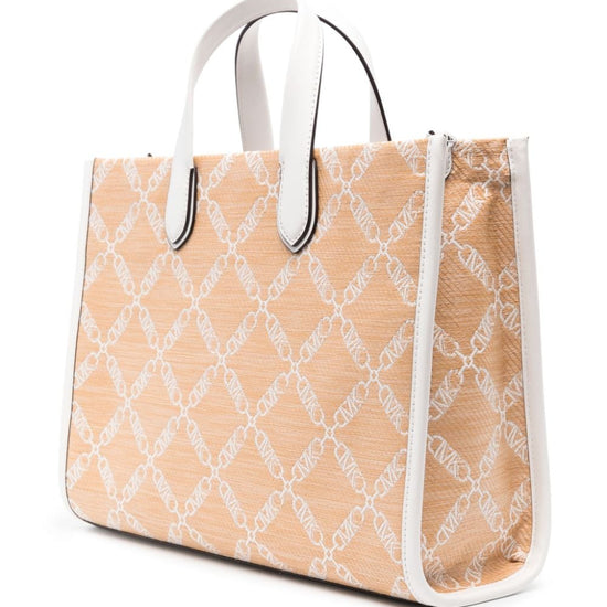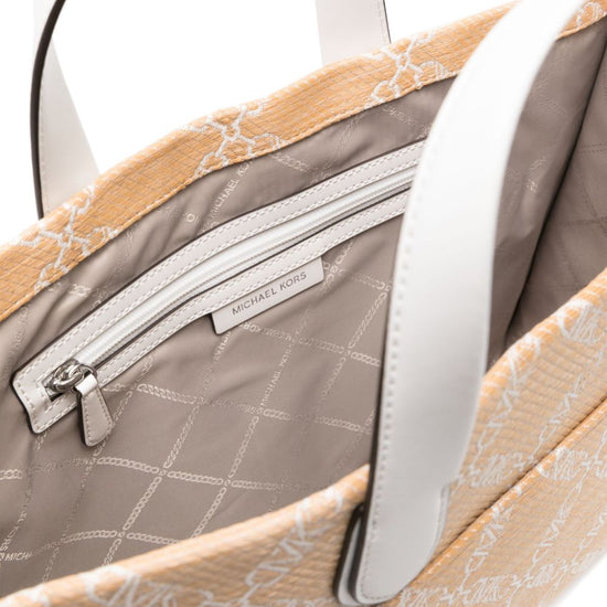 Beige/optical white straw leather trim monogram jacquard open top two rolled top handles adjustable detachable shoulder strap main compartment internal logo patch internal zip-fastening pocket internal patch pockets logo-jacquard lining silver-tone hardware gigi rafia large tote bag size and fit - width 15,75 in / 40 cm