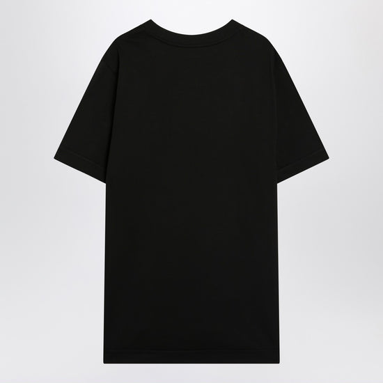 Moncler black cotton t-shirt, characterized by a crew neck design, logo patch on the chest, short sleeves, and a straight hem.