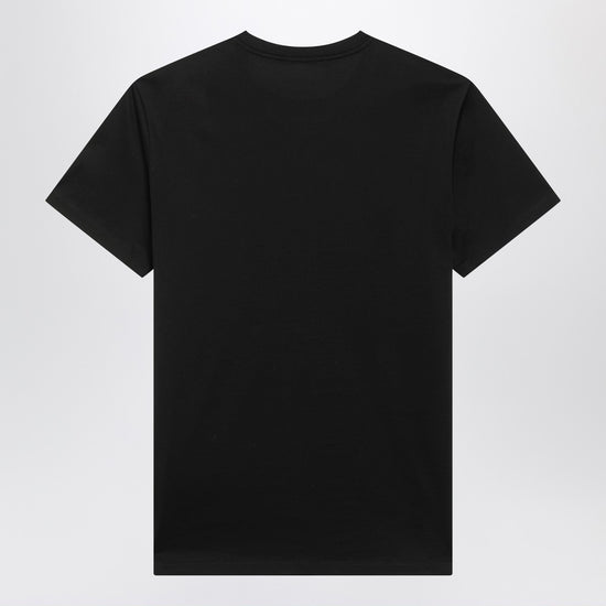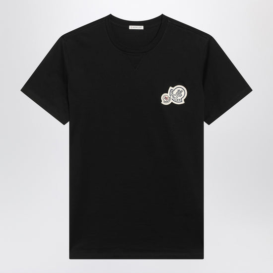 Moncler black cotton crewneck t-shirt featuring short sleeves and multiple logo patches on the chest.