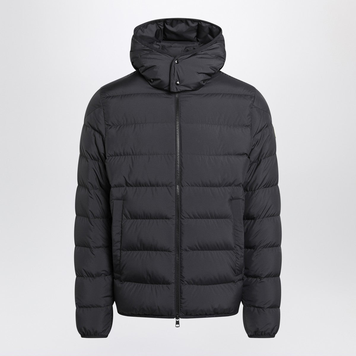 Black hooded moncler down jacket featuring a double front zip closure, quilted design, two side pockets, and long sleeves, one with a logo patch. size and fit - model wears size 3 model measurements: height: 187 cm chest: 102 cm waist: 76 cm hips: 92 cm