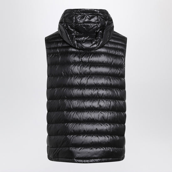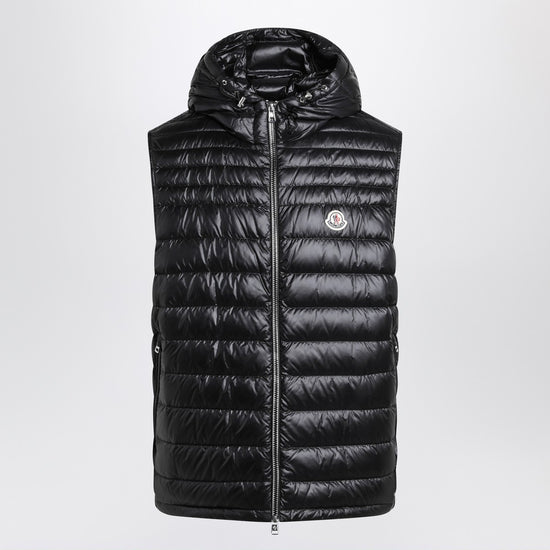 Moncler down-filled vest in water-repellent black nylon, featuring mixed-size quilting, adjustable drawstring hood, double zip closure, zip pockets, and logo patch on the chest.