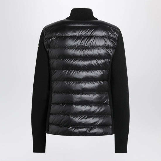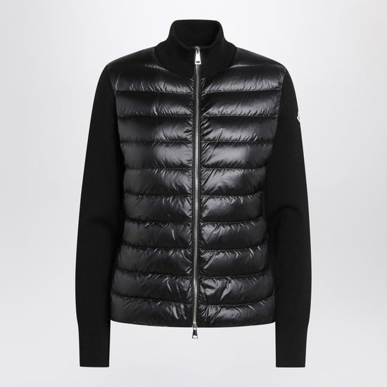 Padded cardigan by moncler in black nylon, characterized by long sleeves in wool, one with a logo patch, front closure with double zip, two side pockets with zip, raised collar, and ribbed edges. size and fit - model wears size s model measurements: height: 178 cm chest: 83 cm waist: 63 cm hips: 91 cm