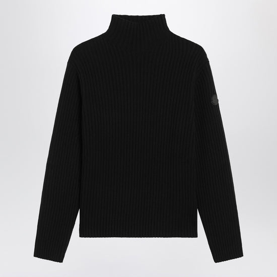 Moncler black wool and cashmere sweater featuring ribbed knit texture, high neck, and logo patch on the sleeve. size and fit - model wears size l model measurements: height: 187 cm chest: 100 cm waist: 79 cm hips: 96 cm