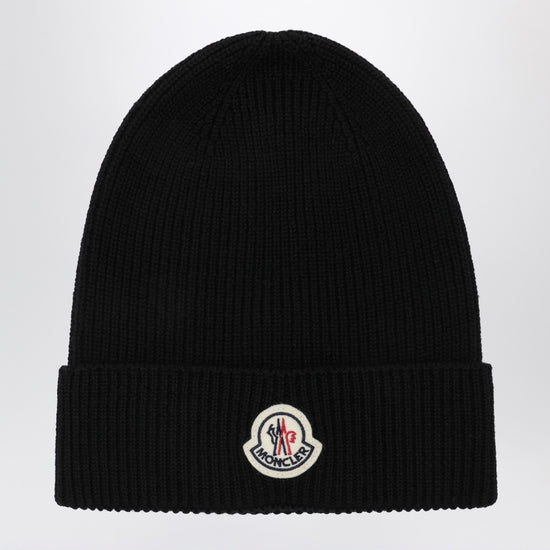 Moncler black wool beanie featuring ribbed design and turn-up with logo patch on the front.