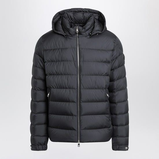 Black moncler down jacket featuring a quilted design, visible double front zip closure, long sleeves with snap-adjustable cuffs, removable drawstring hood, drawstring hem, and two side zip pockets. size and fit - model wears size 3 model measurements: height: 187 cm chest: 102 cm waist: 76 cm hips: 92 cm