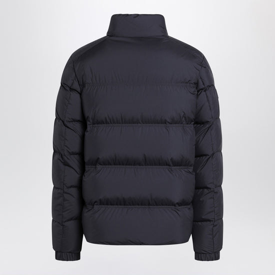 Blue moncler down jacket featuring long sleeves with a logo patch on one arm, front double zip closure, quilted design, high collar, elastic cuffs, tricolor detail on the front, and two side pockets. size and fit - model wears size 3 model measurements: height: 187 cm chest: 102 cm waist: 76 cm hips: 92 cm