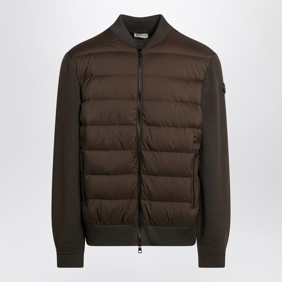 Brown nylon padded cardigan by moncler, featuring wool knit sleeves, logo patch on the sleeve, double-slider front zip closure, side zip pockets, and ribbed cuffs and hem.