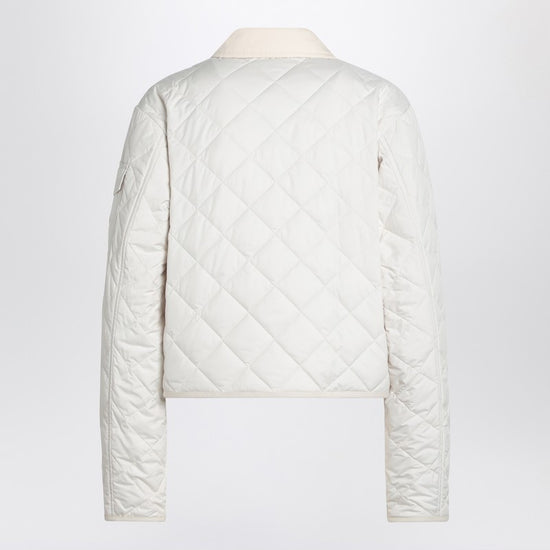 Ivory quilted jacket by moncler, characterized by a cotton collar, snap button closure, two front flap pockets, and long sleeves, one of which has an applied pocket with logo patch. size and fit - model wears size 1 model measurements: height: 177 cm chest: 83 cm waist: 62 cm hips: 90 cm
