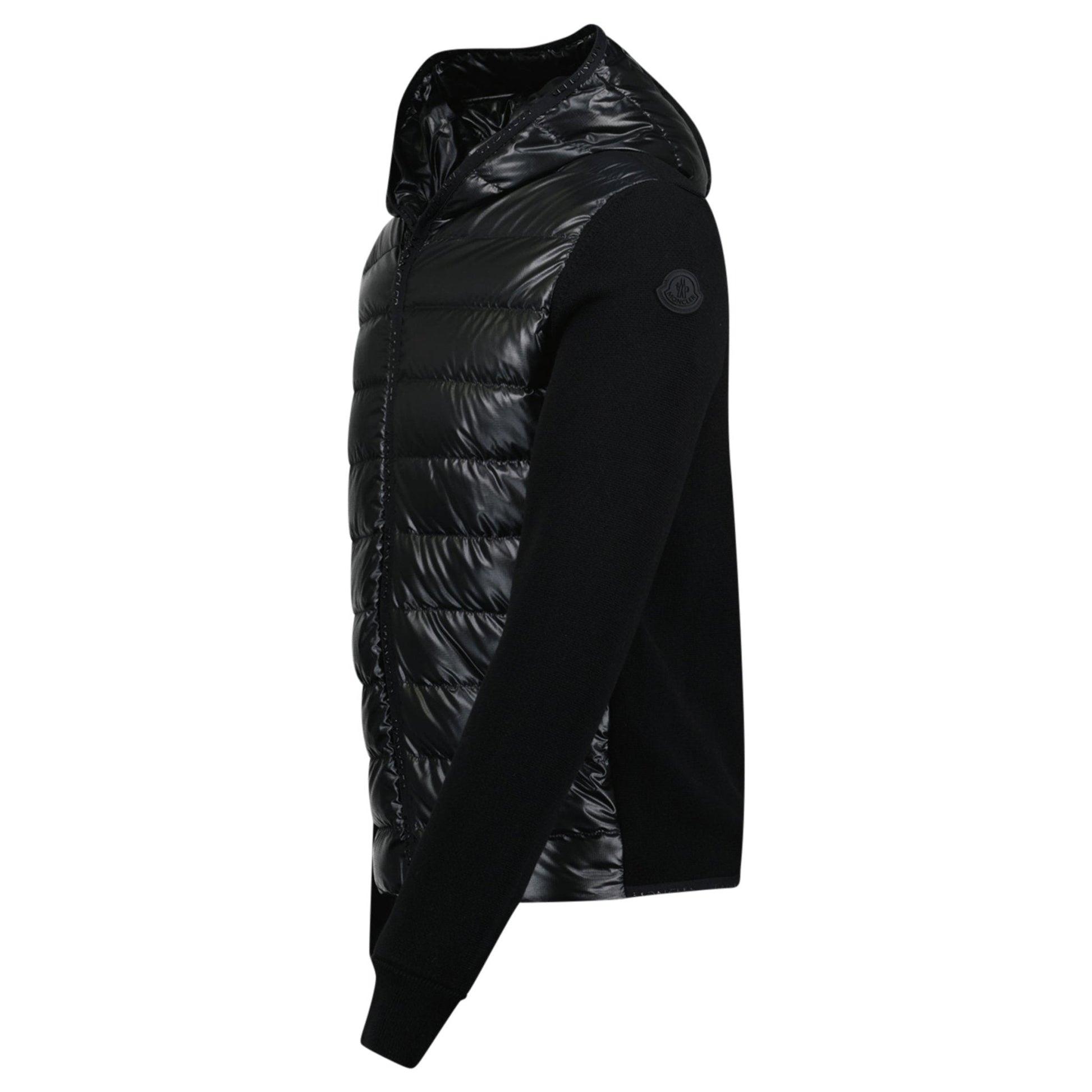 elevate your outerwear with the moncler hybrid 'cardigan tricot' zip down ghost logo jacket in a versatile black color. this sophisticated piece combines the warmth of a down jacket with the lightweight feel of nylon, making it perfect for transitional weather. the jacket features a zip fastening for easy wear and front zip pockets for secure storage. the subtle yet distinct black moncler logo on the sleeve adds a touch of luxury branding, emphasizing its high-quality design.