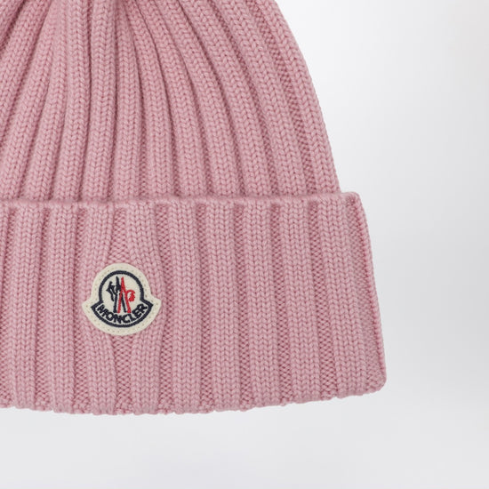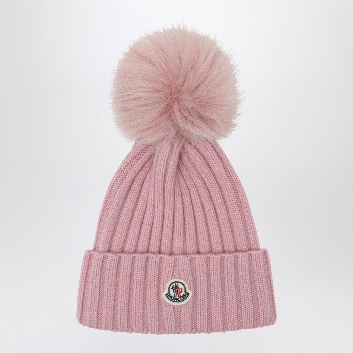 Moncler pink wool beanie featuring ribbed design, synthetic pompom, and turn-up with logo patch on the front.