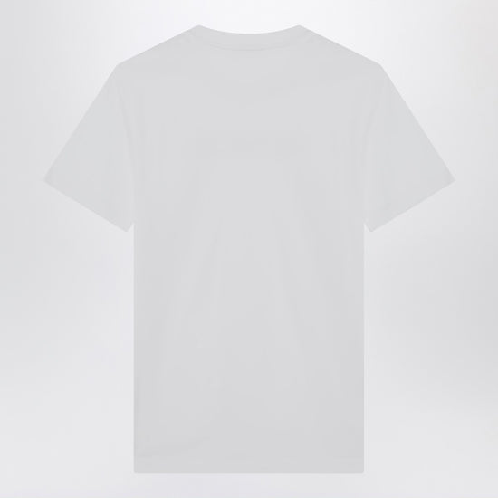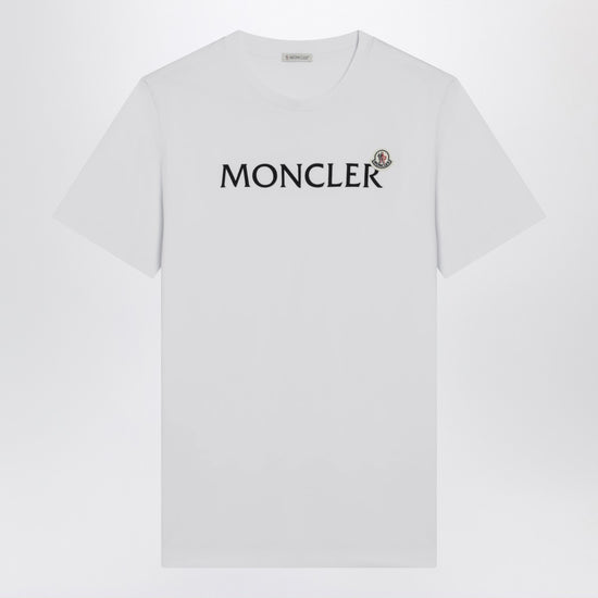 Moncler white cotton crewneck t-shirt featuring short sleeves, printed logo and logo patch on the front.