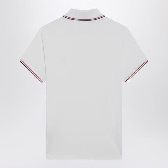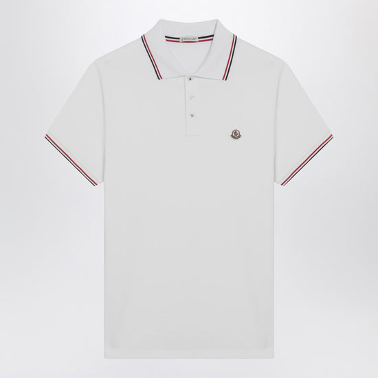 Moncler short-sleeve polo shirt in white cotton featuring classic collar, three front buttons, striped details on collar and sleeves, and logo patch on the chest. size and fit - model wears size l model measurements: height: 187 cm chest: 100 cm waist: 79 cm hips: 96 cm