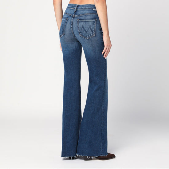 Mother flared jeans in stretch cotton denim characterized by a mid-rise waist, belt loops, five pockets, logo embroidery on the back pockets, and a raw hem. size and fit - model wears size 26 model measurements: height: 179 cm chest: 82 cm waist: 65 cm hips: 90 cm