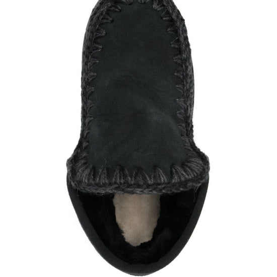 Black sheepskin suede slip-on style logo patch to the rear tonal crochet trim round toe shearling lining ankle-length flat rubber sole eskimo bounce sneaker boots