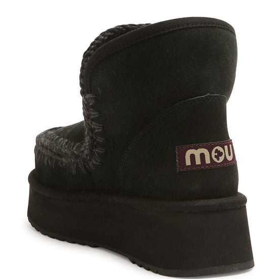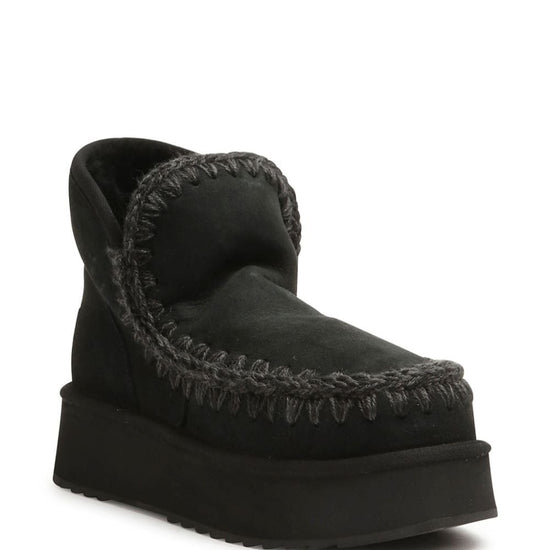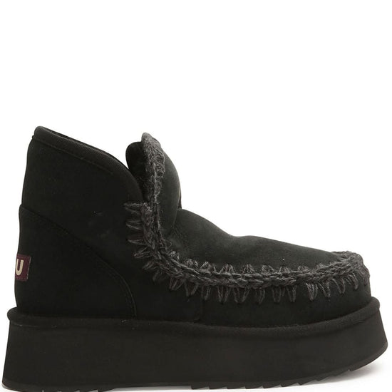 Black suede whipstitch trim appliqué logo ankle-length round toe flatform sole mini eskimo platform boots