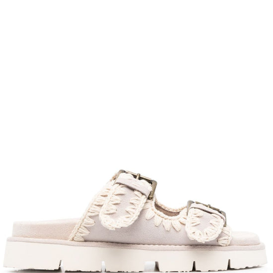 White/beige calf leather/fabric crochet knit gold-tone buckle fastening chunky rubber sole bio low sandals size and fit - sole 2 cm