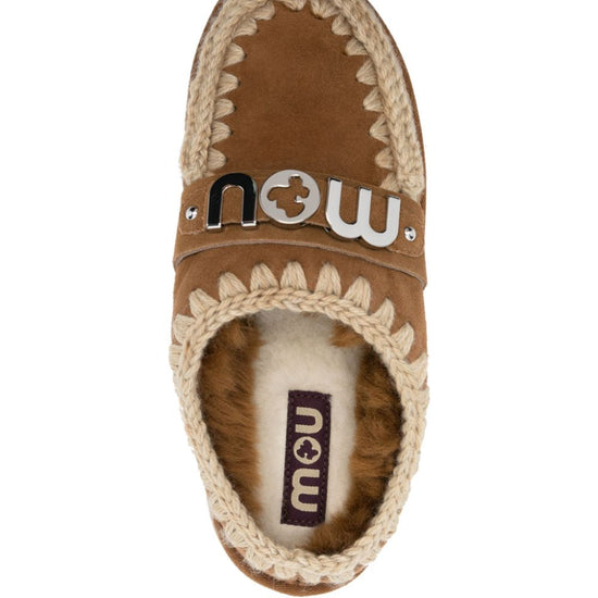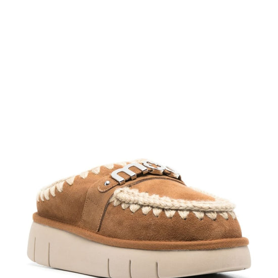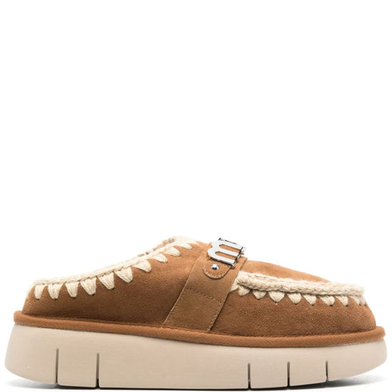 Camel brown calf leather silver-tone logo plaque round toe slip-on style chunky rubber sole bounce clog slippers