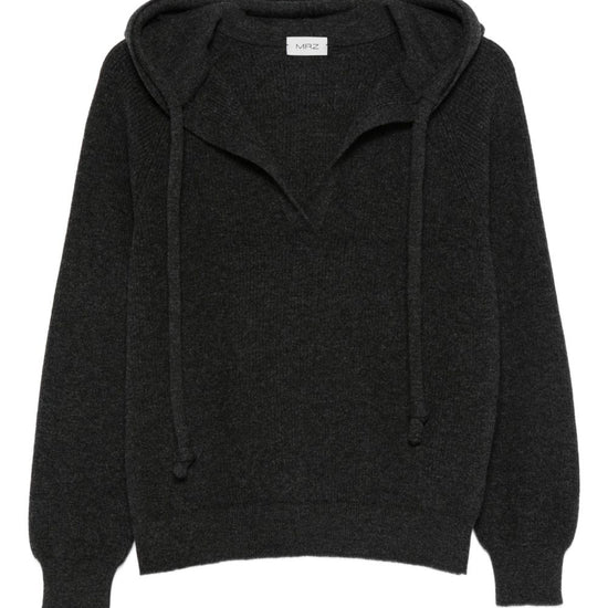 Charcoal grey hooded drawstring tie fastening v-neck wool and cashmere hoodie