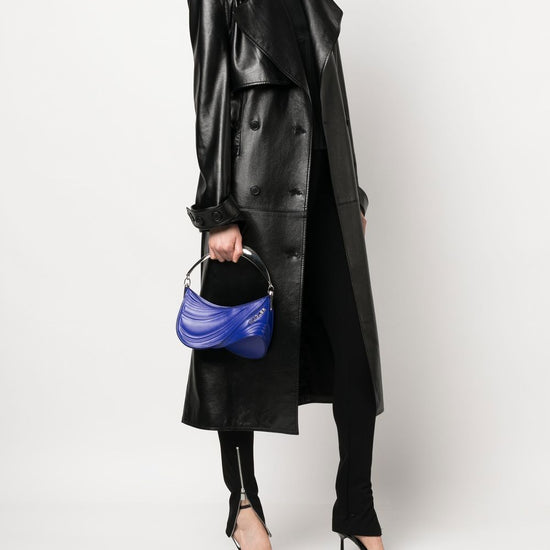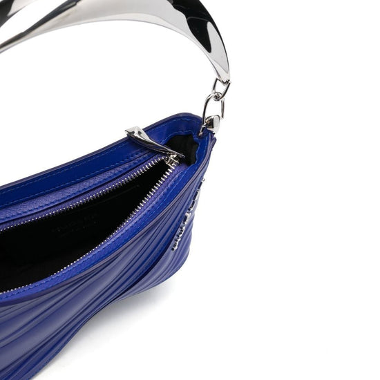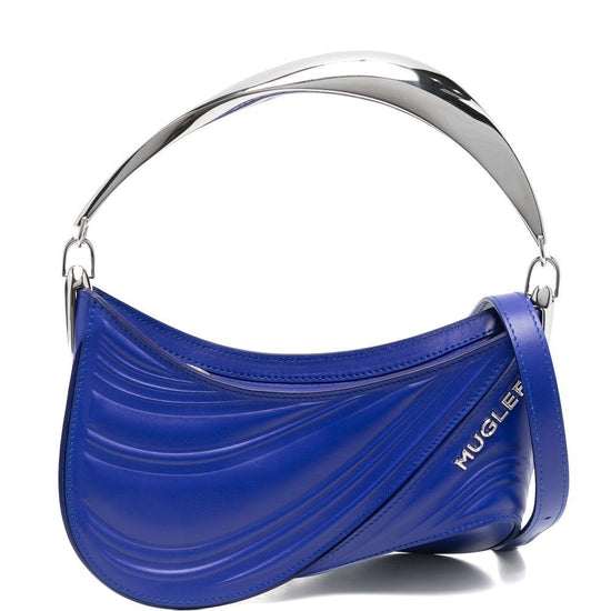 Small spiral curve 01 embossed tote bag from mugler featuring electric blue, calf leather, embossed detail, silver-tone logo lettering, single metallic top handle, top zip fastening, main compartment and detachable shoulder strap. spiral curve 01 small shoulder bag size and fit - width 9,45 in / 24 cm
