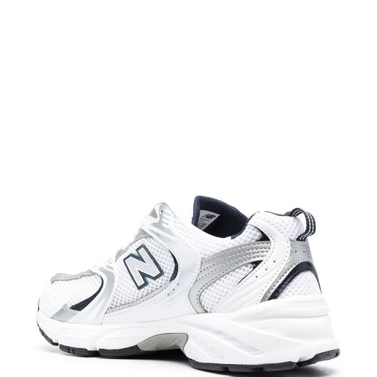 White/navy blue calf leather mesh panelling logo patch to the front logo-print tongue rear pull tab branded insole signature abzorb® midsole ridged rubber sole 530 sneakers