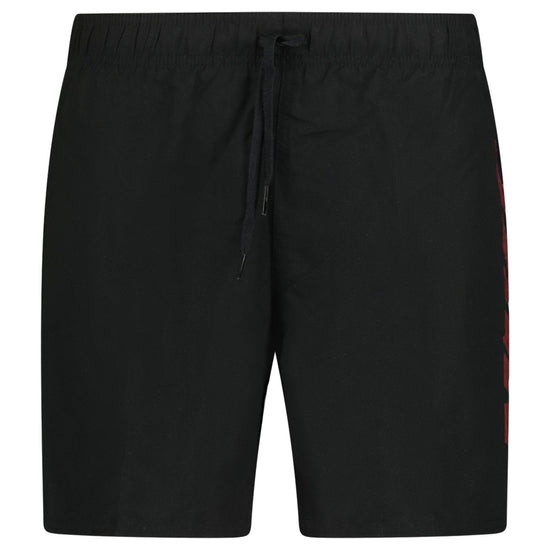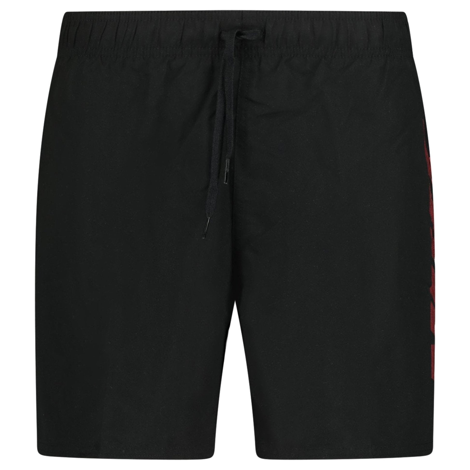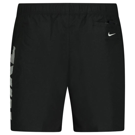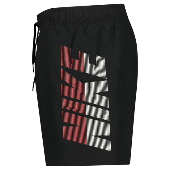 make a splash with the nike logo swim shorts in black, featuring a bold nike logo accented by red and white stripes along the side. designed for comfort and practicality, these swim shorts have an elastic waistband with an adjustable drawstring for the perfect fit. a discreet nike swoosh logo adorns the back pocket, adding a subtle branded touch.