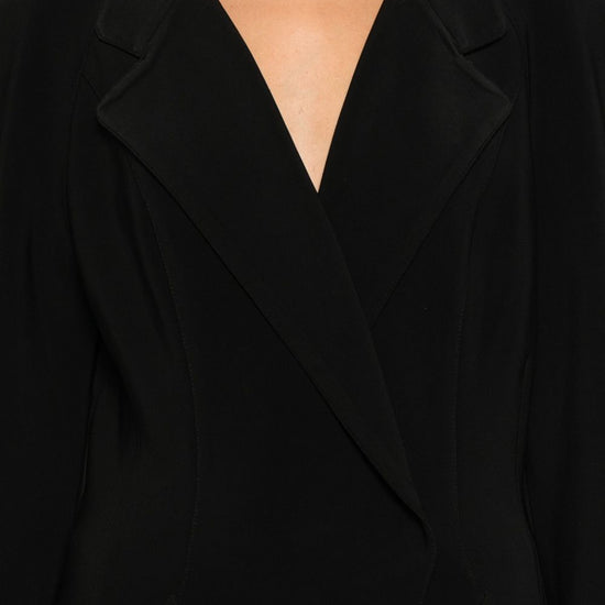 Black notched lapels draped detail long sleeves curved hemline double-breasted jacket