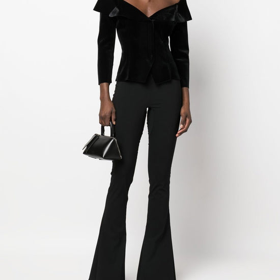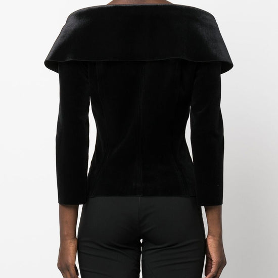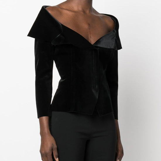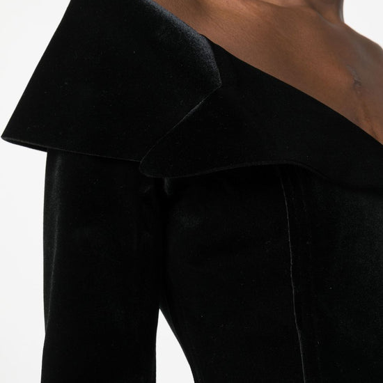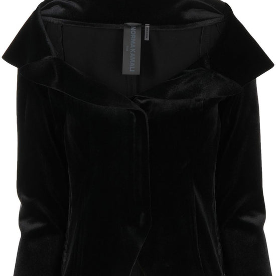 Bardot-neckline long-sleeve jacket from norma kamali featuring jet black, velvet, bardot neckline, concealed front fastening, long sleeves and straight hem. m/p, corta, scollo v single-breasted blazer jacket size and fit - this piece fits true to size. we recommend you get your regular size. model is 1,75m / 5ft 8in wearing size s