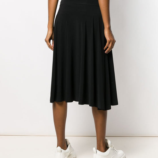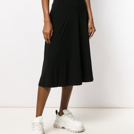 Black flared midi skirt from norma kamali featuring a high waist. flared jersey skirt