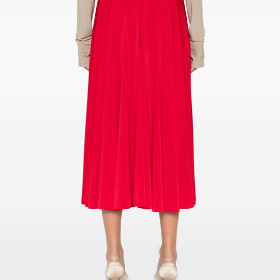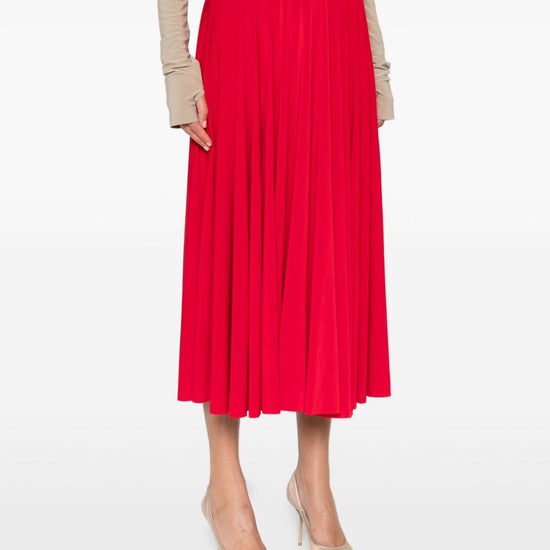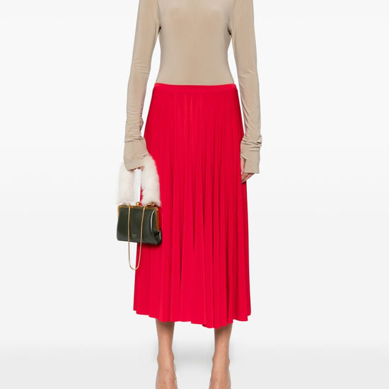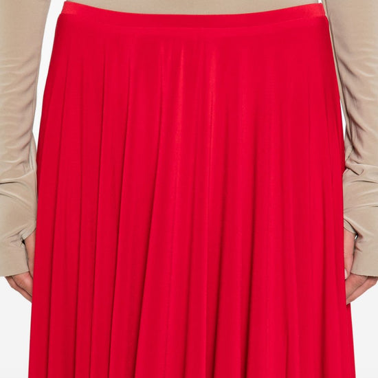 Red pleated midi length a-line shape high waist straight hem pleated midi skirt size and fit - this piece fits true to size. we recommend you get your regular size. model is 1,75m / 5ft 8in wearing size s