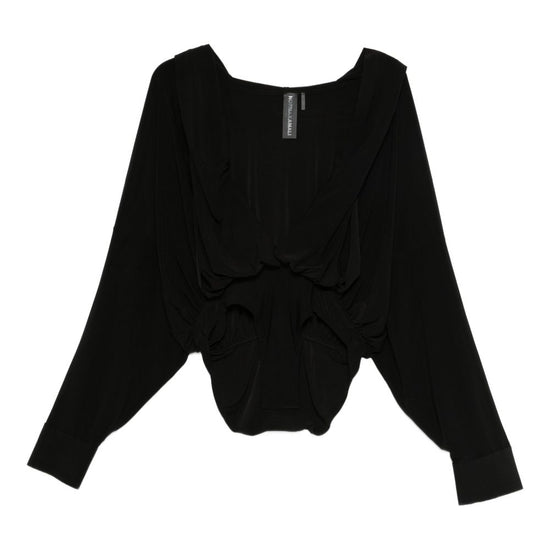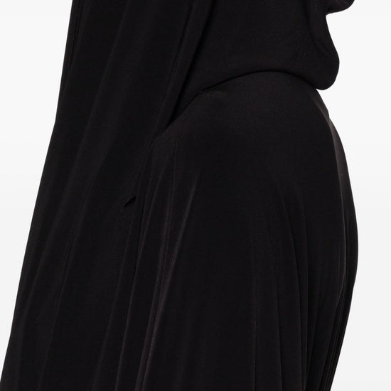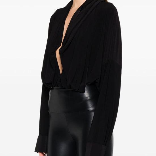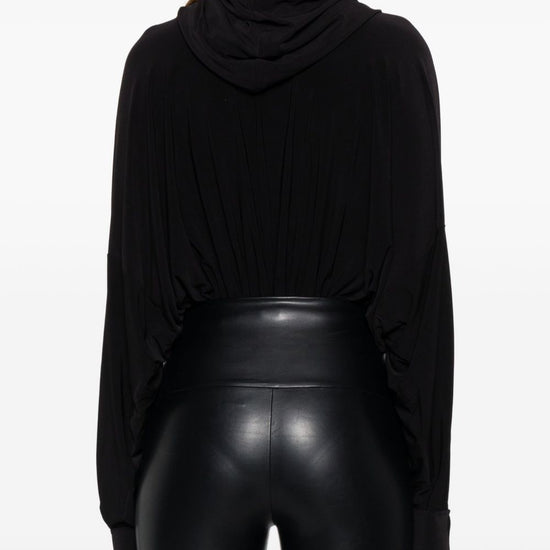 Black long sleeves ruched detail just a reminder that this piece must be tried on over your own garments. oversized hooded bodysuit