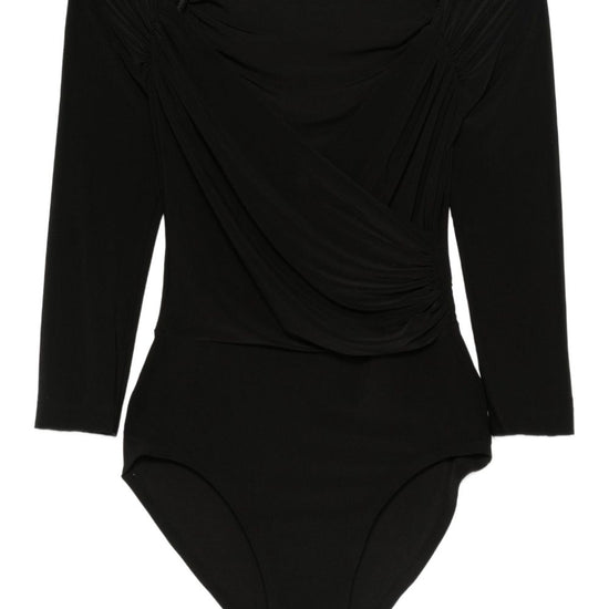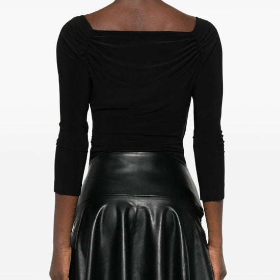 Black draped detailing square neck three-quarter sleeves gathered detailing just a reminder that this piece must be tried on over your own garments. off shoulder bodysuit