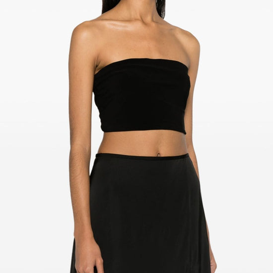 Black stretch-jersey ruched detailing bandeau style square neck strapless straight hem cropped full lining bandeau top