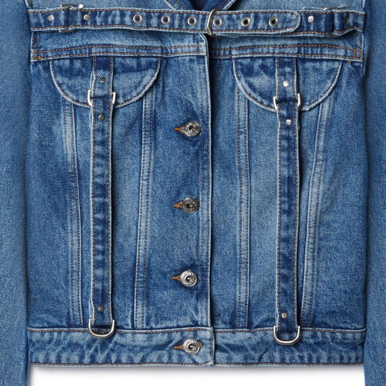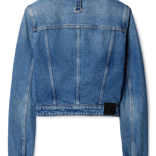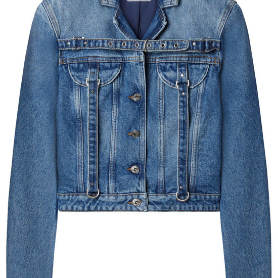 Belt-detailed denim jacket from off-white featuring blue, cotton, denim, notched collar, front button placket, long sleeves, buttoned cuffs, two chest flap pockets and straight hem. cropped denim jacket size and fit - this piece fits true to size. we recommend you get your regular size. model is 1,75m / 5ft 8in wearing size 40 (it)