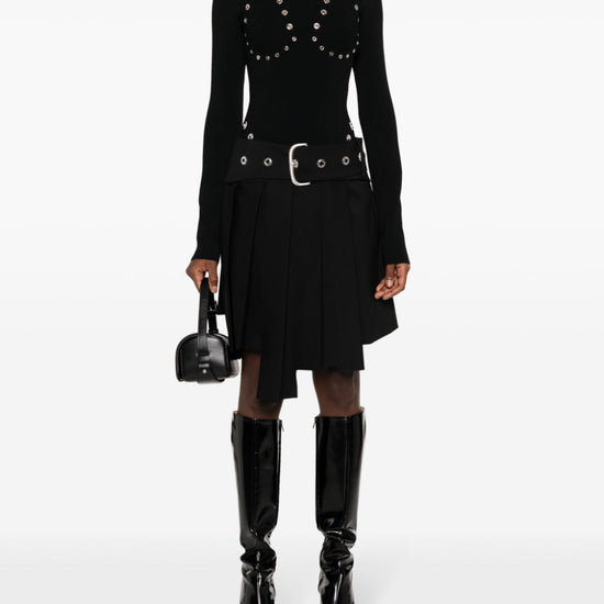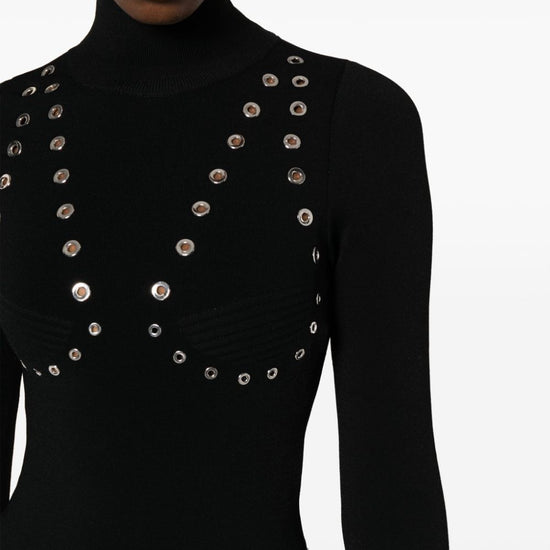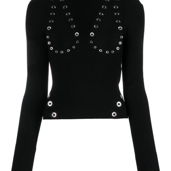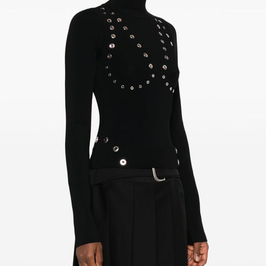Eyelet-embellished knitted top from off-white featuring black, knitted construction, eyelet embellishment, high neck, silver-tone hardware, long sleeves, short rear zip fastening and straight hem. high neck viscose sweater size and fit - this piece fits true to size. we recommend you get your regular size. model is 1,75m / 5ft 8in wearing size 40 (it)