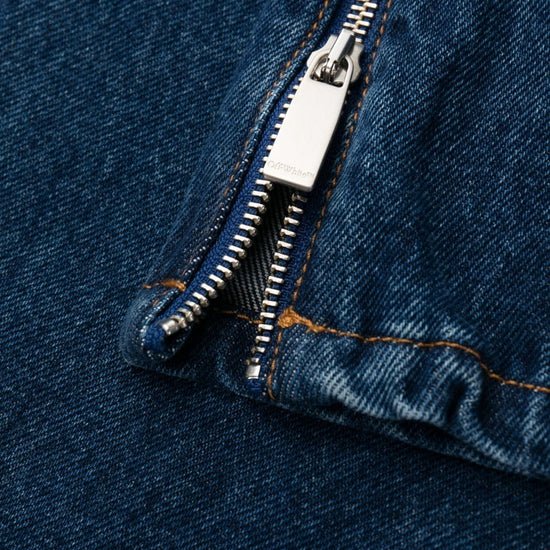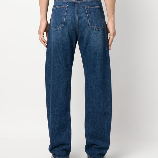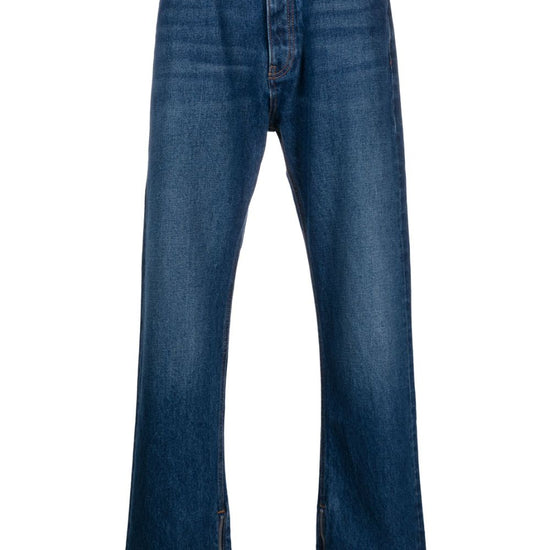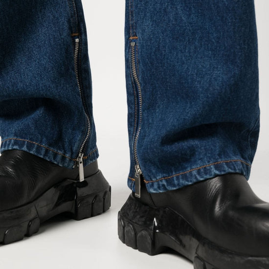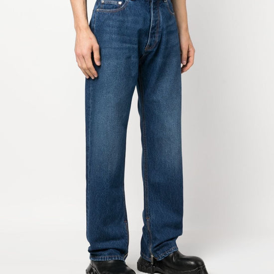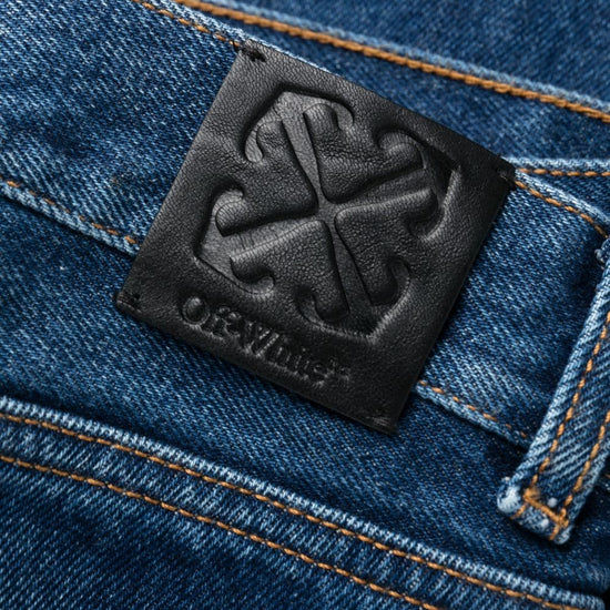 High-waist straight-leg jeans from off-white featuring indigo blue, cotton, denim, logo patch to the rear, high-waisted, belt loops, straight leg, front button fastening, classic five pockets and ankle zips. skate denim jeans size and fit - this piece fits true to size. we recommend you get your regular size. model is 1,84m / 6ft 1in wearing size 32 (waist cm)