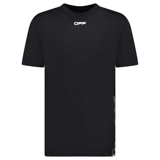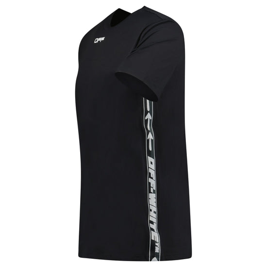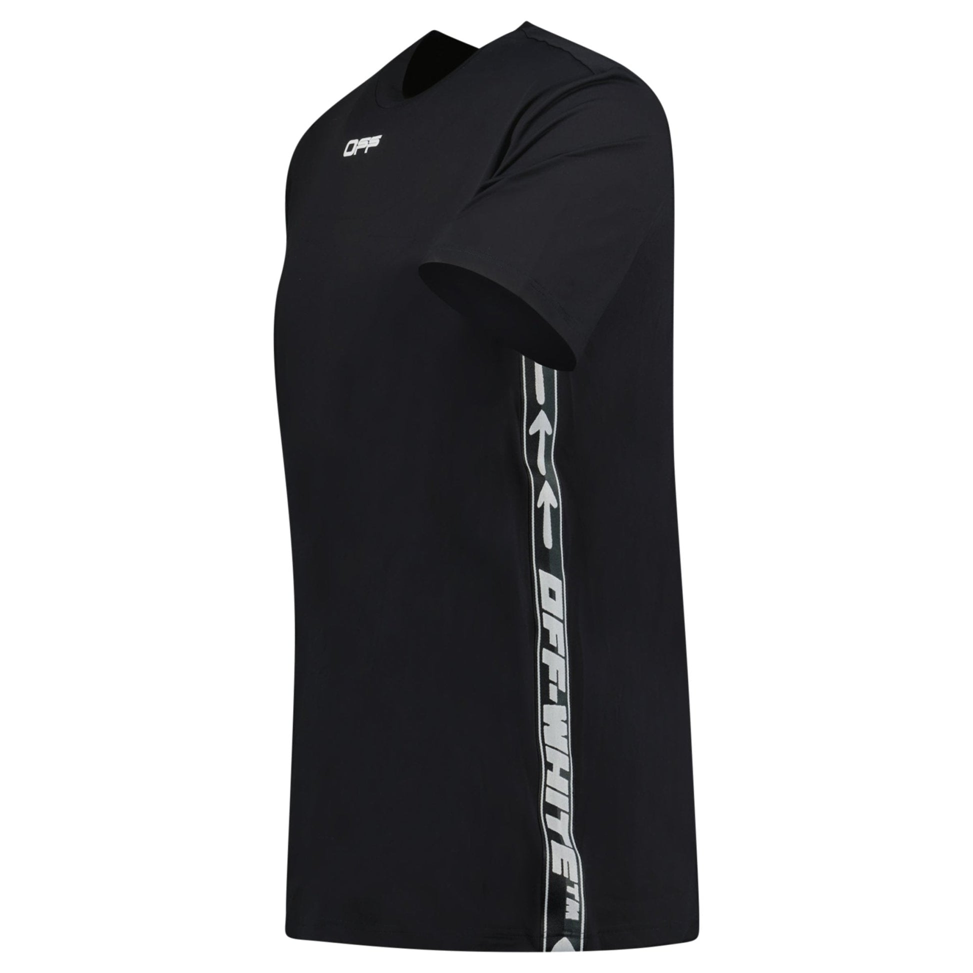 an essential for the fashion-forward, the off-white logo band sport t-shirt in black effortlessly blends streetwear aesthetics with functional design. this semi-fitted t-shirt is perfect for both athletic looks and casual everyday ensembles, making it a versatile addition to any wardrobe.