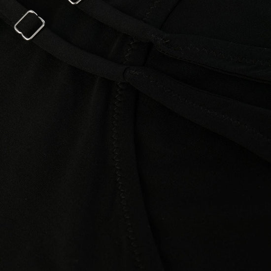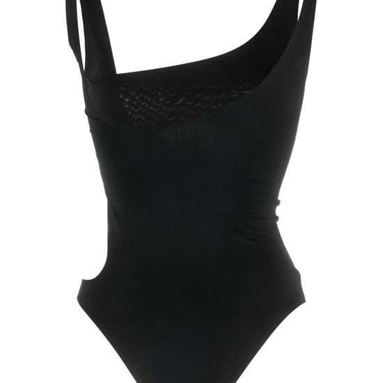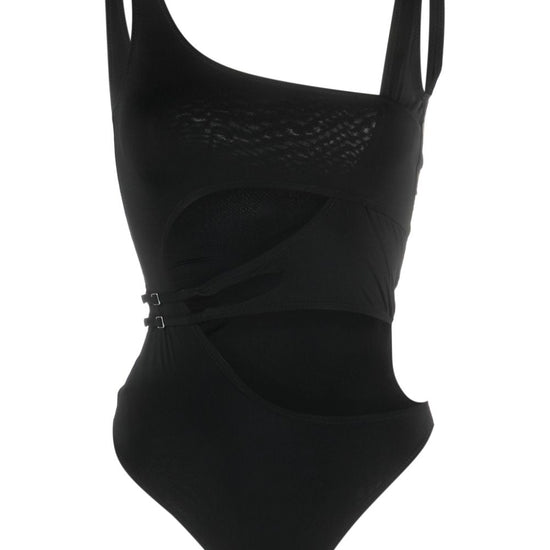 Cut-out high-cut swimsuit from off-white featuring black, stretch-design, cut-out detailing, double buckle fastening, asymmetric neck, thin shoulder straps and high cut. be mindful to try on swimwear over your own garments.. meteor meteor swimsuit size and fit - this piece fits true to size. we recommend you get your regular size. model is 1,75m / 5ft 8in wearing size 40 (it)